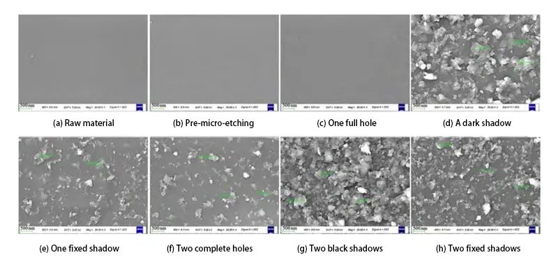The trend of graphite particle changes during the second round of hole-opening, shadowing, and fixing processes was similar to that of the first round (Fig. 2(f), (g), (h)).