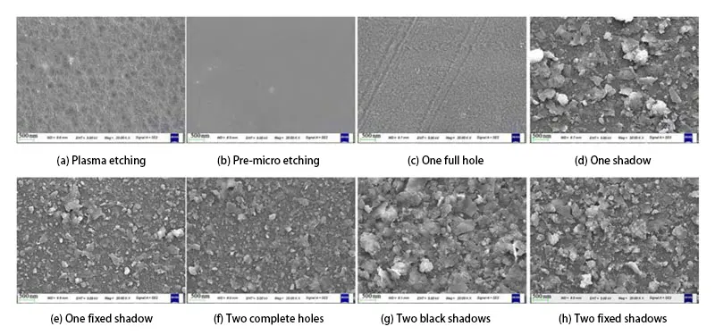 Therefore, changes in the film plane can serve as a reference for evaluating material adsorption on hole walls, enabling a preliminary assessment of carbon-plating effectiveness on flexible copper-clad laminate hole walls.
