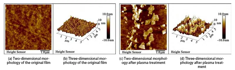 The surface roughness of the PI film before and after plasma treatment was measured using AFM. Rq denotes the root mean square deviation of the profile, while Rz represents the maximum height of the profile.