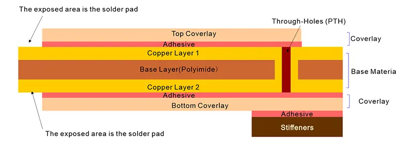 The layer structure of a double-sided flex PCB is key to ensuring mechanical flexibility and signal reliability. Below is a standard flex circuit design stack-up: