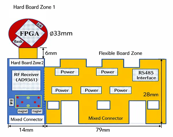 The current approach employs rigid-flex board design, integrating RF signal transmission/reception and information processing microsystems onto a small-area rigid board, while distributing passive components, power supplies, interfaces, and other functional elements onto a large-area flexible board.