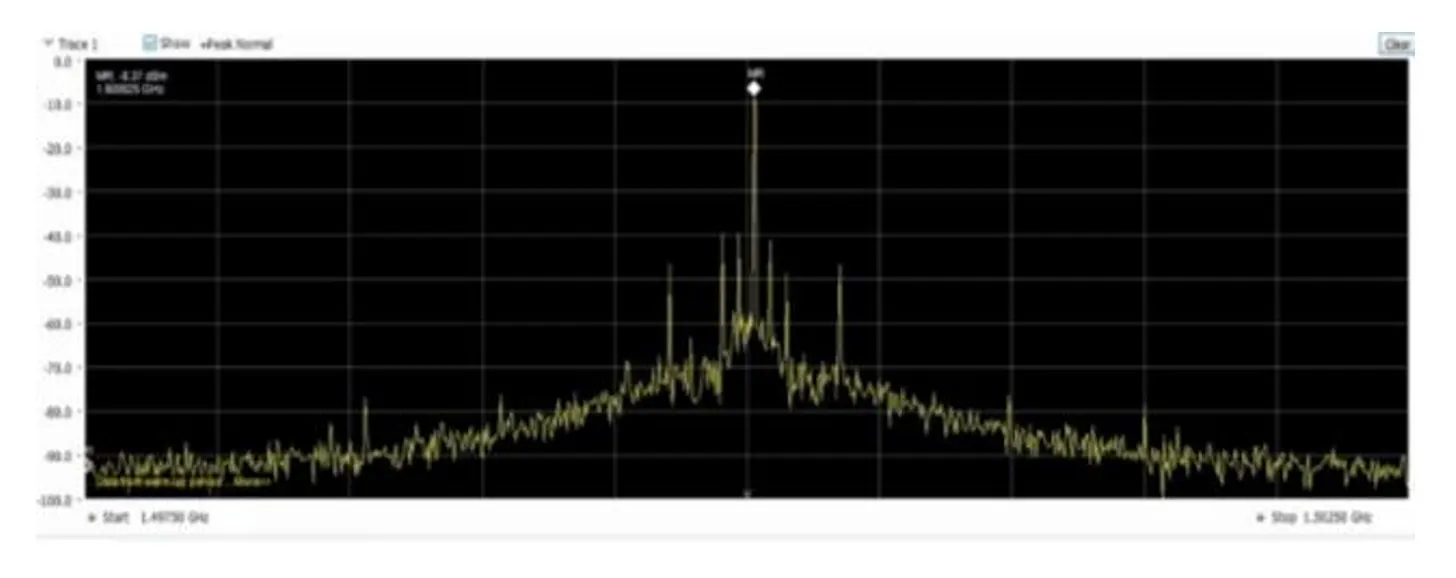 The FPGA and RF transceiver components powered up and operated normally. Figure 9 shows the transmitted signal spectrum test results.