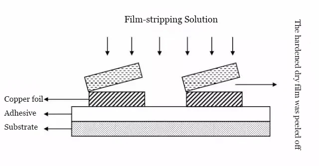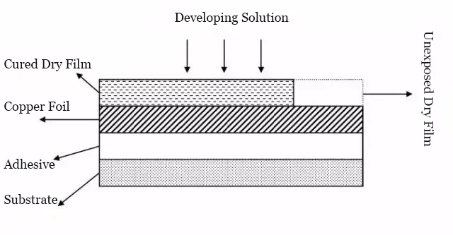 Process Purpose: The weak alkaline solution removes the unpolymerized portions of the dry film.