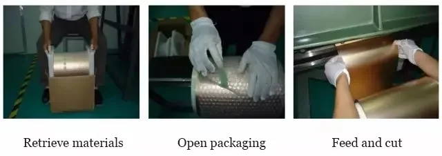Copper foil with formed circuits undergoes AOI scanning to detect circuit defects. Standard circuit image data is stored in the AOI host.
