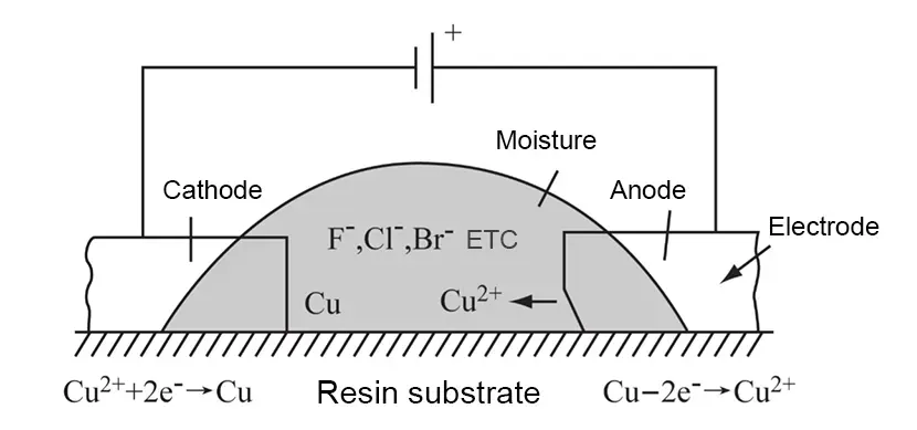 A common scenario involves failures occurring in ion migration chambers, only to revert to normal upon retesting, severely hindering failure analysis and improvement efforts. The electrochemical reaction for CAF failure is illustrated in Figure 1.