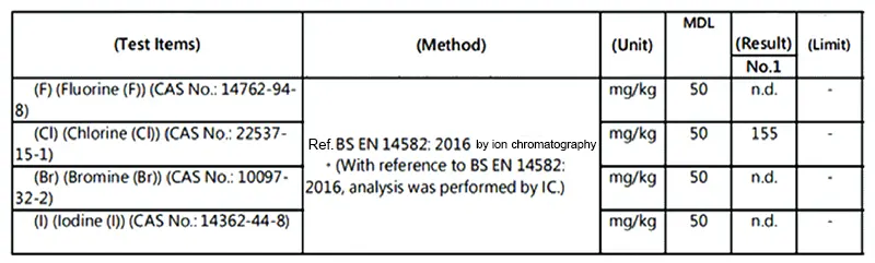 The SGS ion chromatography test results for the CVL used in this study indicate a Cl⁻ concentration of 155 mg/kg, as shown in the test report screenshot in Figure 14. Calculations reveal a surface Cl⁻ content of 0.59 μg/cm².