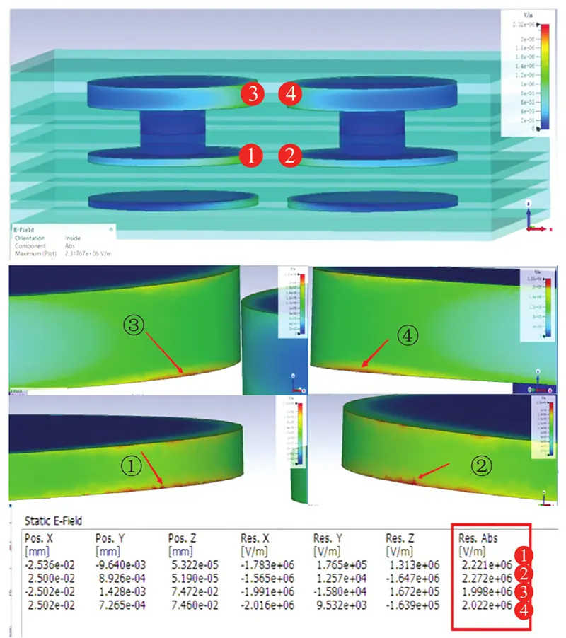Physical field simulations, as shown in Figure 15, reveal the following electric field strengths: – Inner layer PAD position 1: 2.221×10⁶ V/m – Inner layer PAD position 2: 2.27×10⁶ V/m while the outer layer PAD position 3 recorded 1.998×10⁶ V/m and PAD position 4 measured 2.022×10⁶ V/m.