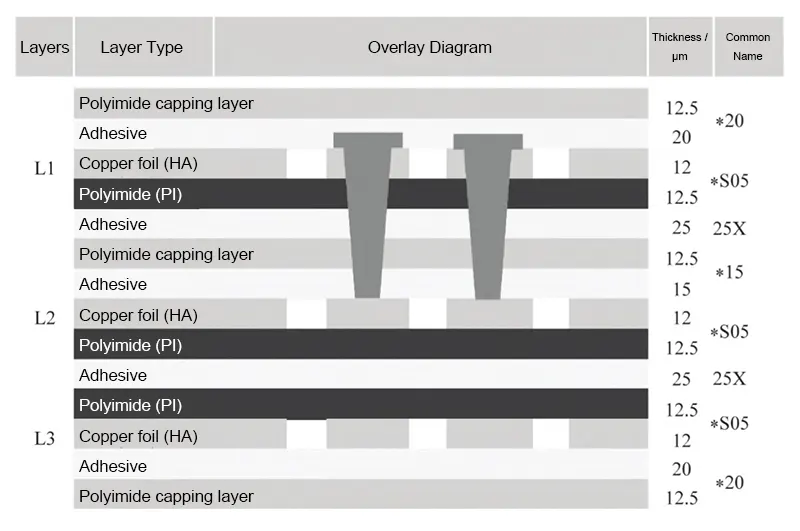 This board features a 3-layer 1+1+1 laminate structure. Each layer uses three sheets of *S05 copper-clad laminate with 25 μm polyimide (PI) thickness and 12 μm copper thickness.