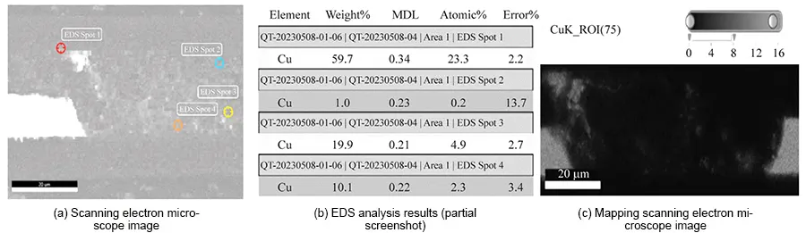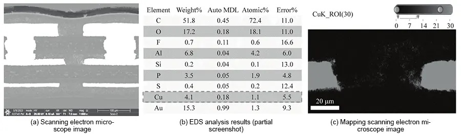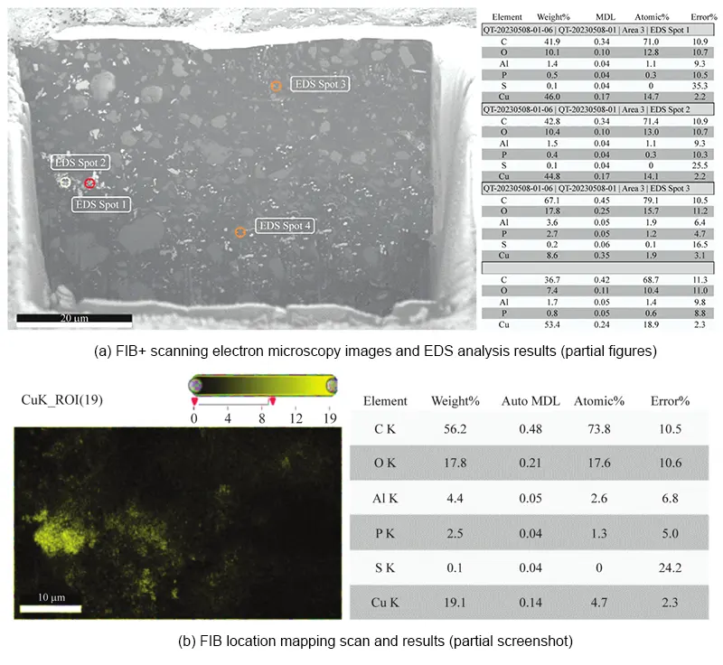 (2) Utilizing tools such as Hotspot analysis, cross-sectioning, SEM, and FIB reveals the distribution morphology of copper ions following CAF failure within the adhesive layer.